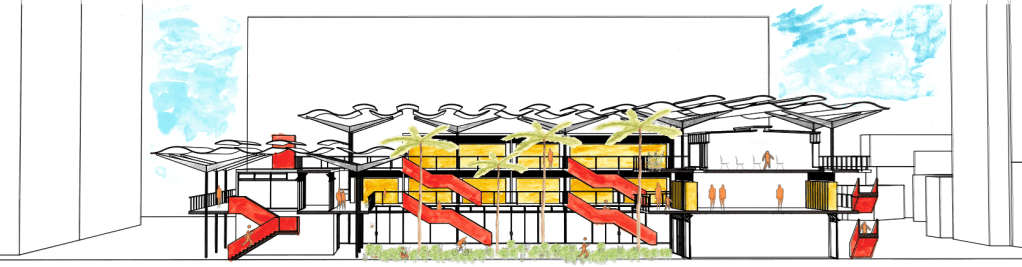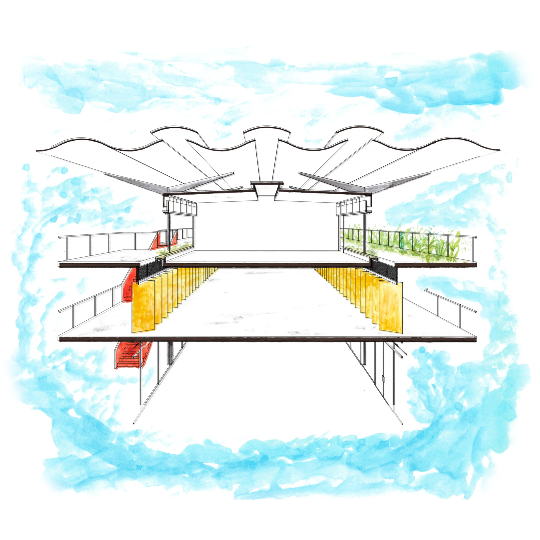 Eu e meus colegas nos inspiramos fortemente nas obras de João Figueiras da Lima. Lelé, como é mais conhecido, sempre teve como partido de projeto estratégias bioclimáticas, e portantanto, pareceu inevitável ter suas construções como referência. Inconfundíveis, seus desenhos sempre coloridos e didáticos também foram uma grande inspiração.