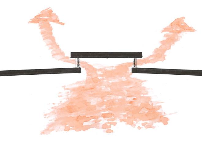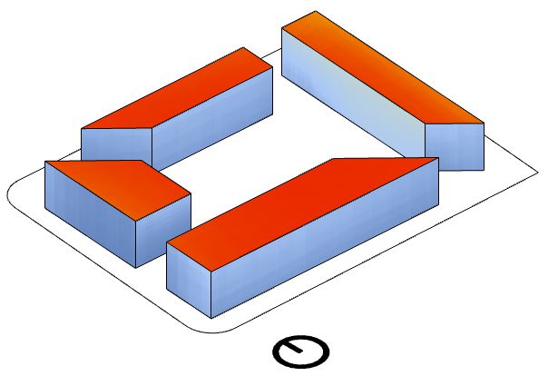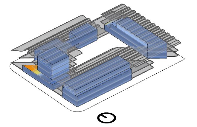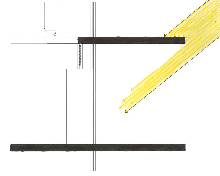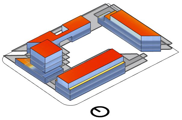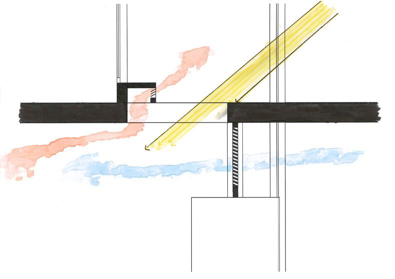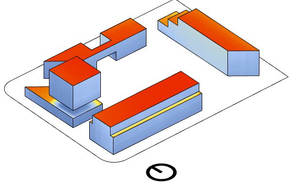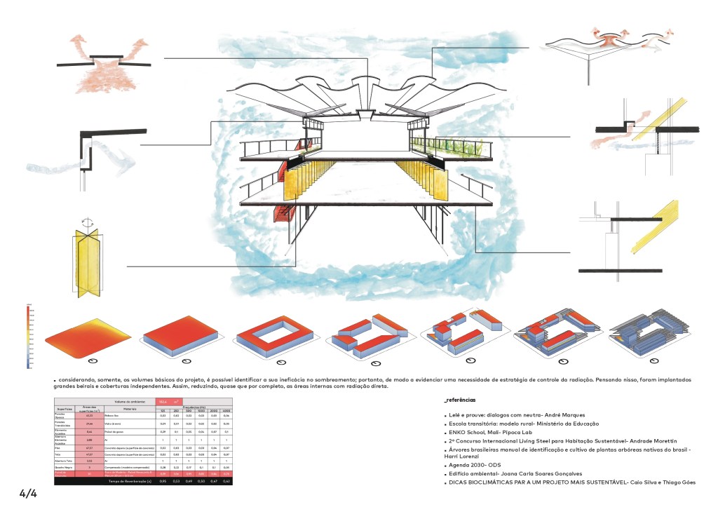 Obviamente o concurso sendo de conforto ambiental nos atemos a questões de ventilação, sombreamento e insolação. A partir da análise do Climate Consultant, aplicação de consulta de informações ambientais, pensamos em soluções passivas para esse difícil contexto termico carioca. Com fachadas permeáveis por meio de portas pivotantes, coberturas com aberturas para ventilação buscando a exaustão natural do ar quente, de aberturas nas duas fachadas maiores de todos os edifícios para a ventilação natural e finalmente proeminentes passarelas e lajes que se estendem muito além dos interiores buscando sombrear as áreas internas.