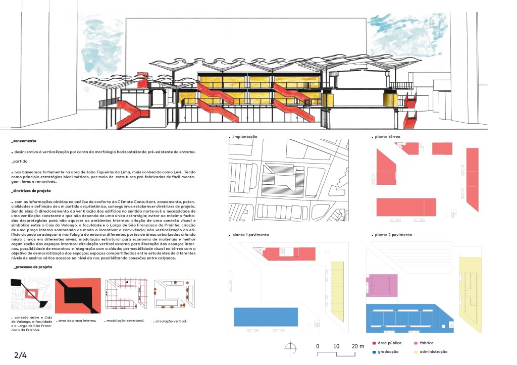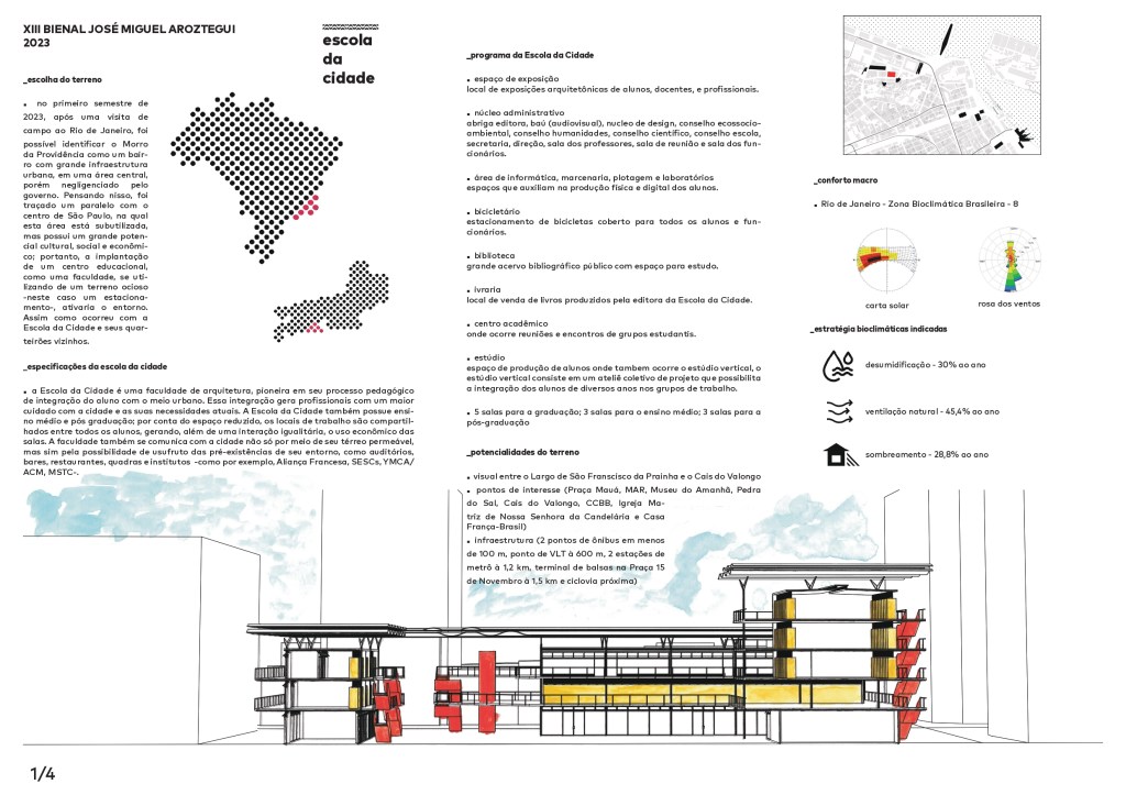 Escola da Cidade – Rio de Janeiro foi produto de um concurso da XIII Bienal José Miguel Aroztegui, que tem como foco o campo do conforto térmico e acústico. O trabalho foi feito em trio e tive como parceiros meus colegas Domenico Santoro e João Vera, e fomos orientados pelas professoras Cristina Caselli e Monica Dolce – e assistentes Eduardo Gasparelo e Laís Coutinho. A premissa foi projetar uma hipotética nova unidade da Escola da Cidade no Rio de Janeiro.